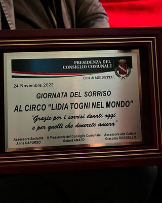 Al termine dello spettacolo ai repsonsabili del circo, per la disponoibilità dimostrata, è stata donata una targa dal Presidente del Consiglio comunale, Robert Amato, dall’assessore alla socialità, Anna Capurso, e dall’assessore alla cultura, Giacomo Rossiello.