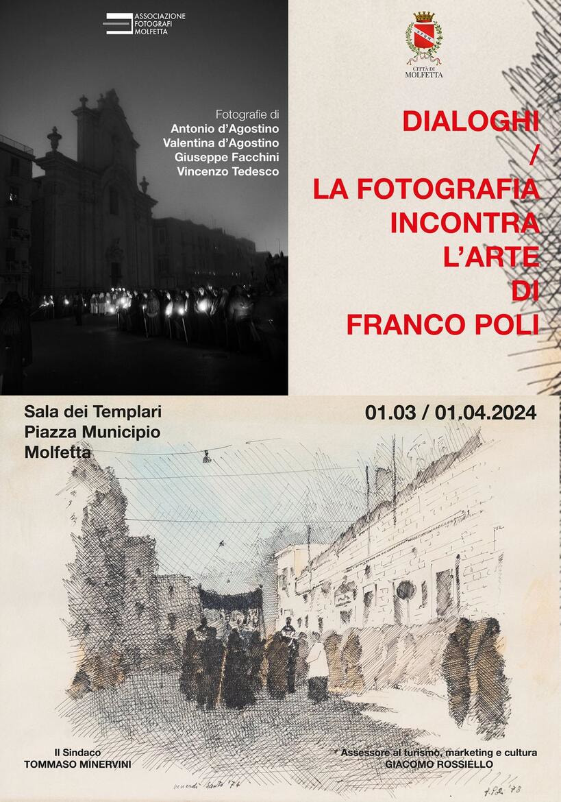 Domani, a partire dalle 19, sarà possibile assaporare da protagonisti un viaggio nell’arte legata alla Quaresima a Molfetta, prima con una sosta nella Sala dei Templari per ammirare, con la guida del critico d’arte, Gaetano Mongelli, le opere del Maestro Franco Poli, in una mostra allestita da Onofrio Grieco della cooperativa FeArt, e con Antonio d’Agostino gli splendidi scatti messi a disposizione dall’Associazione Fotografi Molfetta, poi con una sosta nella Chiesa della Morte e una passeggiata nella città vecchia dove, sui muri perimetrali di Palazzo Tattoli, sarà possibile ammirare gigantografie che raccontano di tradizione, di riti quaresimali che danno corpo ai beni immateriali patrimonio della città.