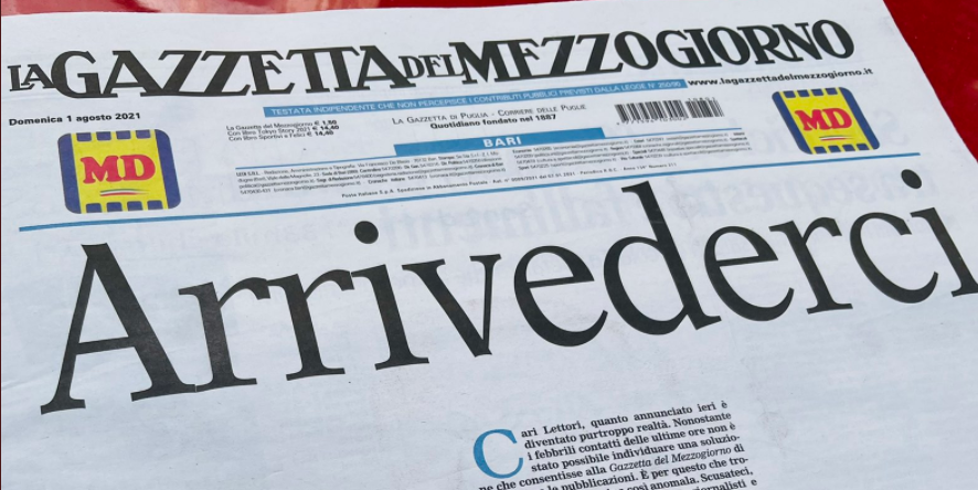 “Un giornale con 134 anni di storia – continua il primo cittadino –, che è il più longevo e il più letto della nostra regione, non può interrompere le pubblicazioni. Come titolato ieri in Prima pagina spero che si tratti soltanto di un “Arrivederci” e che il quotidiano torni il prima possibile a informare tutti i pugliesi. La Gazzetta del Mezzogiorno è una risorsa e un punto di riferimento del nostro territorio”.