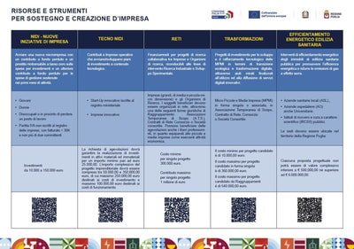 • NIDI: Aiuto per l'avvio di una nuova microimpresa con un contributo a fondo perduto e un prestito rimborsabile a tasso zero sulle spese per investimenti e un ulteriore contributo a fondo perduto per le spese di gestione sostenute nei primi mesi di attività;
