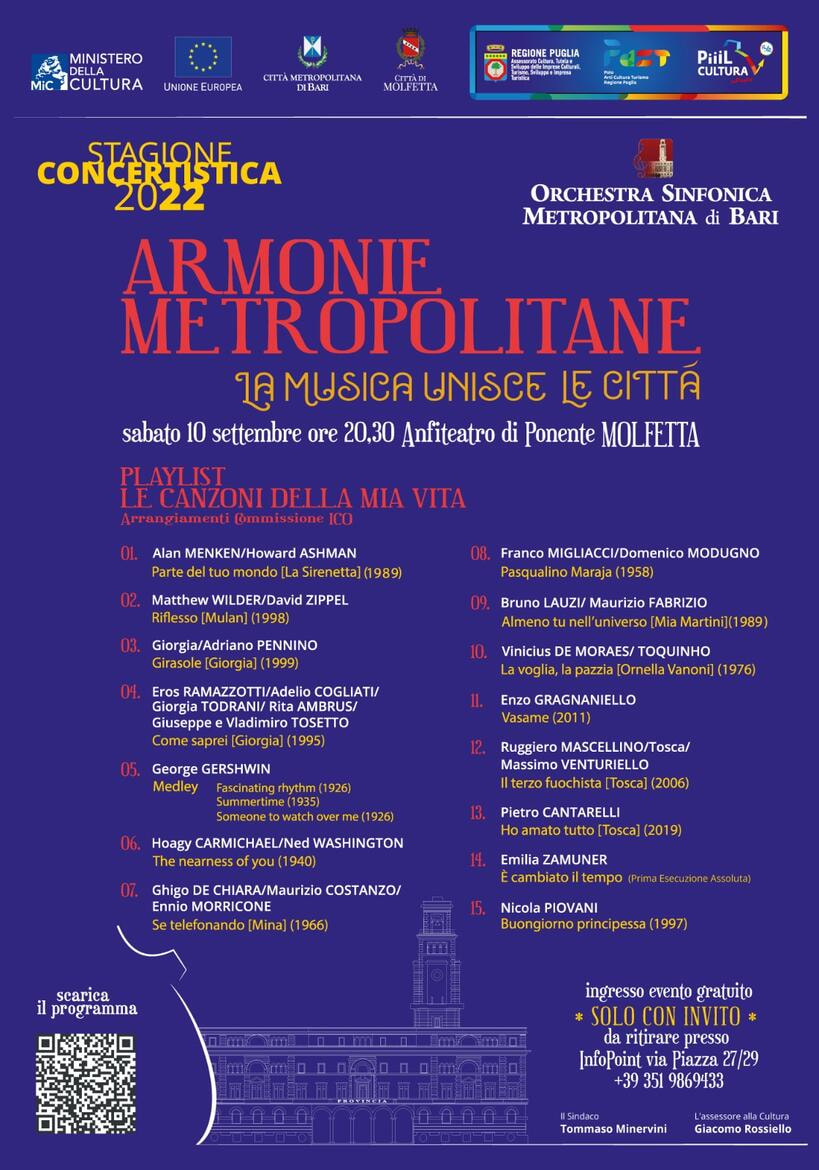 Il concerto, che si avvale del patrocinio del Comune di Molfetta, si intitola “Playlist. Le canzoni della mia vita”. Rientra nella rassegna itinerante “Armonie metropolitane. La musica unisce le città”.