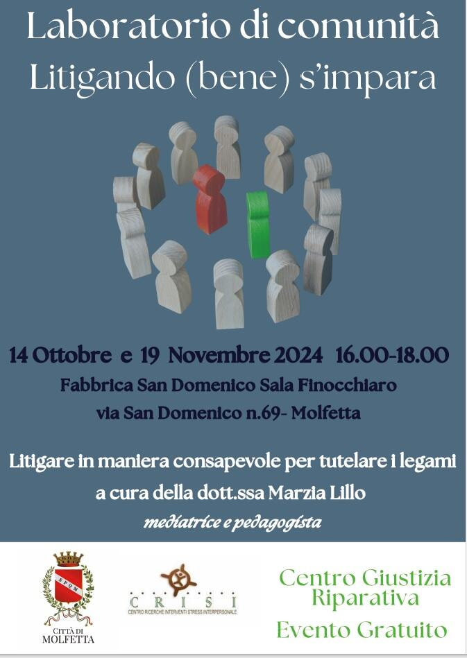 Il Centro di Giustizia Riparativa del Comune di Molfetta, gestito dalla cooperativa Crisi, organizza lunedì 14 Ottobre, presso la Fabbrica San Domenico Sala Finocchiaro, via San Domenico n.69, dalle ore 16.00 alle 18.00, il laboratorio “Litigando (bene) s’impara”.