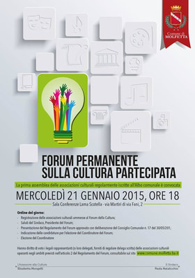Mercoledì 21 gennaio alle ore 18 nella sala conferenze della sede comunale di Lama Scotella (via Martiri di via Fani, 2) è convocato il Forum della Cultura, istituito con delibera di Consiglio Comunale n. 17 del 2014, ai sensi dell'art. 57 dello Statuto Comunale, quale organismo permanente di incontro e reciproco confronto fra le associazioni e le libere forme di aggregazione operanti in città nel campo artistico e culturale.