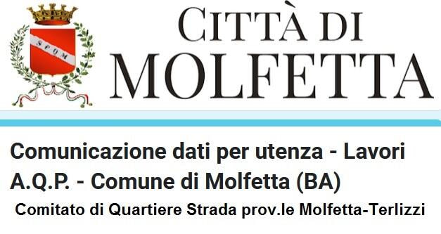 Per consentire ad Aqp di completare nel più breve tempo possibile lo studio preliminare e il censimento finalizzati ad avviare la programmazione tecnico-economica del progetto di realizzazione del tronco idrico sulla Molfetta-Terlizzi, il Comune di Molfetta ha predisposto un form che è possibile compilare il form al link: https://forms.gle/Z9cpsWYCrTh8dwSc8