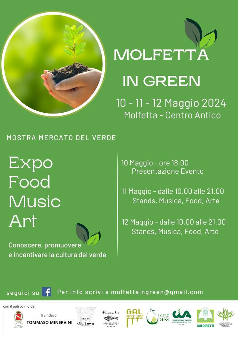 Tutto è pronto per la la prima Edizione di “Molfetta in Green”. Dalla natura alla tavola a Km0, la fiera-mercato, organizzata dall’Associazione ReArte di Molfetta con il patrocinio del Comune di Molfetta in collaborazione con l’Assessore all’Ambiente Caterina Roselli, ha come fine quello di creare un lavoro sinergico per incentivare e promuovere la cultura del verde.