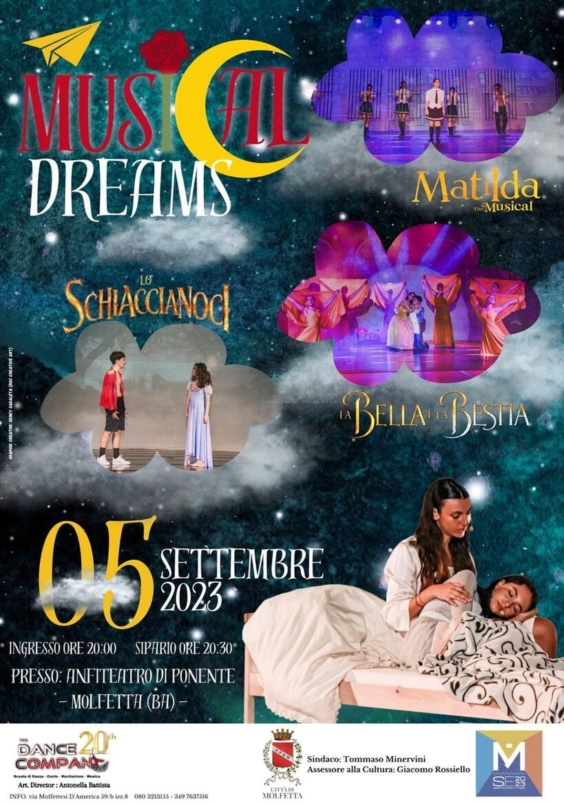 Martedì 5 settembre, con inizio alle ore 20.30, Dance Company presenta "Musical Dreams”, viaggio nel mondo della fantasia dove è possibile ritrovarsi al posto di Clara, con il suo Schiaccianoci, il giorno della vigilia di Natale; entrare nel castello della Bestia e assistere all'amore inaspettato sbocciato con Belle; ritrovarsi al posto di Matilda, una delle alunne nella terribile scuola gestita dalla preside Trinciabue.