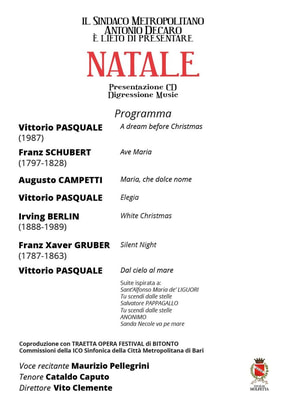 Voce recitante Maurizio Pellegrini, tenore Cataldo Caputo, in scaletta ci sono le composizioni originali e gli arrangiamenti di Vittorio Pasquale commissionati dall’ICO e brani di Vittorio Pasquale, Franz Schubert, Augusto Campetti, Irving Berlin e Franz Xaver Gruber.