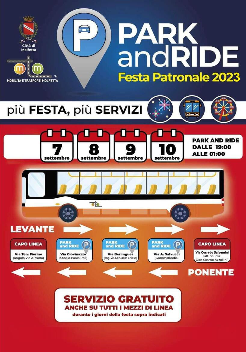 «Anche quest’anno abbiamo pensato di istituire il Park&ride gratuito per consentire a tutti – sottolinea il Sindaco, Tommaso Minervini - di poter raggiungere i luoghi della festa agevolmente senza restare imbottogliati nel traffico. Si potranno lasciare le auto nei parcheggi gratuiti e sempre di lì si potranno prendere i mezzi della Mtm. Negli stessi giorni anche tutte le altre corse cittadine saranno gratuite».