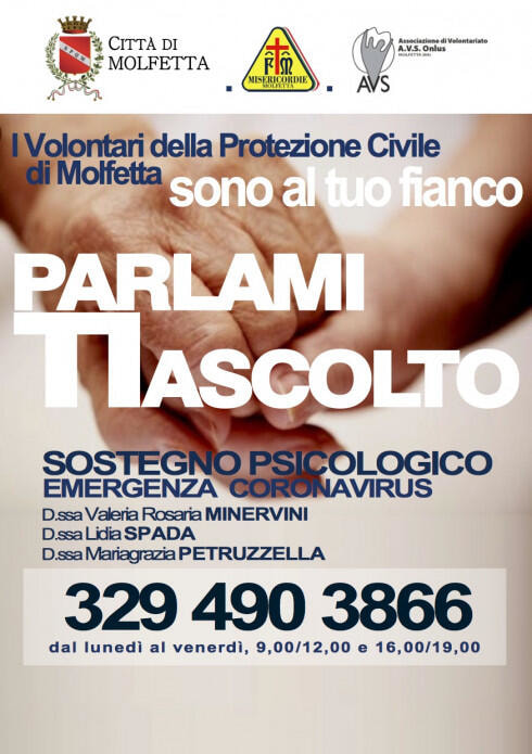 Sono 84 le chiamate pervenute, dal 23 marzo al 22 maggio 2020, al numero 3294903866 per usufruire della consulenza telefonica gratuita delle dottoresse Valeria Minervini e Lidia Spada, psicologhe e volontarie della Misericordia di Molfetta e della dottoressa Maria Grazia Petruzzella, psicoterapeuta e volontaria dell’AVS di Molfetta, nell’ambito di Parlami, ti ascolto, servizio di supporto psicologico attivato dall’Amministrazione durante il lockdown.
