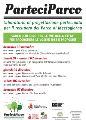 Si realizzerà un tour di appuntamenti in diversi luoghi della città (scuole, parrocchie, piazze). In ogni tappa sarà allestito un presidio temporaneo del laboratorio, dove si raccoglieranno idee, proposte e suggerimenti da parte degli abitanti sugli usi e le attività che il futuro progetto di recupero del parco dovrà promuovere.