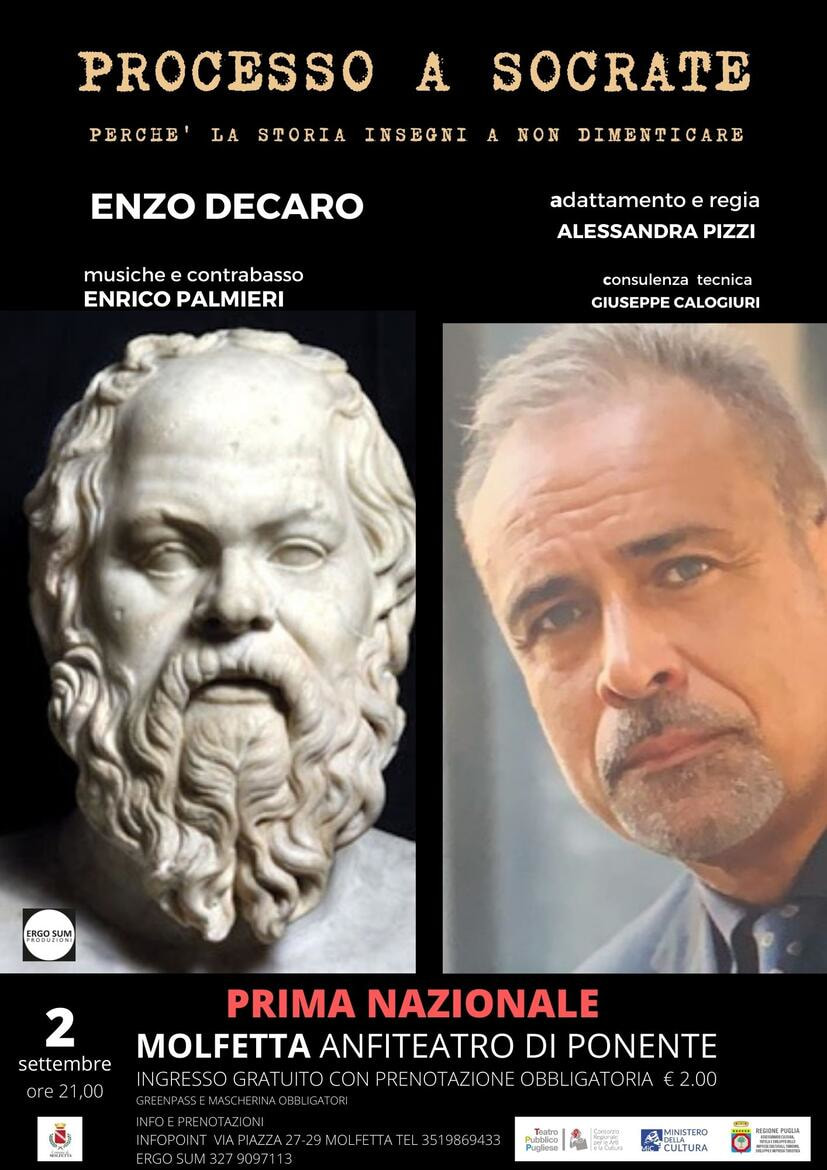 Il prossimo 2 settembre, l’anfiteatro comunale di ponente, alle 21, nell’ambito della programmazione culturale estiva predisposta dall’amministrazione comunale, ospita la prima nazionale di Processo a Socrate, la nuova produzione di Ergo Sum, per la regia di Alessandra Pizzi. Un nuovo progetto artistico che si ascrive nella lunga e costante tradizione della regista pugliese impegnata nella “riscrittura” dei grandi classici della letteratura.