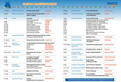 Lunedì 18 aprile alle ore 11 in aula consiliare (piazza Municipio) si è svolta la cerimonia di presentazione di Molfetta Città europea dello sport 2016. Con la partecipazione delle associazioni sportive cittadine è stato presentato il primo calendario degli appuntamenti che caratterizzeranno l'anno dello sport a Molfetta, formulate dopo un avviso pubblico.