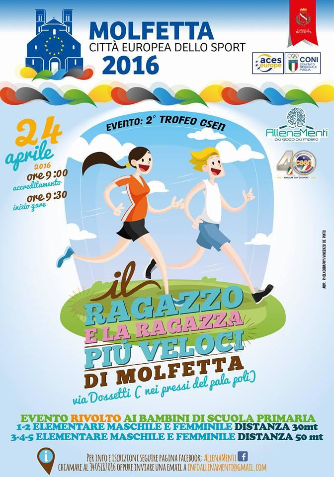 Il Comune di Molfetta e l' Associazione AllenaMenti, in occasione di "Molfetta città Europea dello Sport", organizzano l'evento sportivo, non agonistico, "2° trofeo CSEN il ragazzo e la ragazza più veloci di Molfetta". Tutti i bambini di scuola primaria sono invitati a partecipare alla manifestazione che si terrà domenica 24 aprile 2016 alle ore 8.30 in via Angelo Ribera (nei pressi del palazzetto Pala Poli), zona 167.