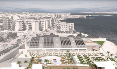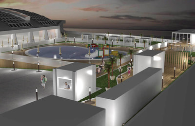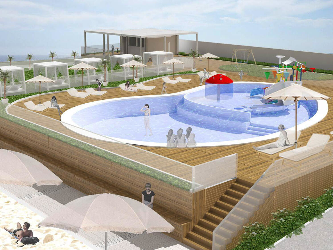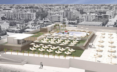 RIQUALIFICAZIONE DELL’AREA ESTERNA Nel tempo l'area ha subito diverse modifiche, come ad esempio, la sostituzione dell'area di servizio esterna in un'area in cui venivano installati degli ombrelloni su un sottofondo di ghiaia. Si rende perciò necessario il ripristino dell'area di servizio esterna, rispettando la normativa in tema antincendio. L'area incolta, al cui interno era disposto un campo di beach volley, verrà riqualificata attraverso la realizzazione di una pavimentazione in legno amovibile, la quale abbraccerà una piscina scoperta, anch'essa amovibile. Tutte le superfici previste eliminano le barriere architettoniche, rendendo la nuova area totalmente accessibile ai diversamente abili ai sensi del D.M. 14 giugno 1989 n. 236. Inoltre, la nuova area disporrà di idonei dispositivi e sistemazioni antincendio, nel rispetto della vigente normativa. La costruzione di una nuova vasca ludica scoperta creerà una zona perimetrale di qualità e di interesse pubblico, poiché si rivolge alla comunità in modo da garantire un servizio che permettere di utilizzare gli spazi non solo dell'impianto natatorio esistente, ma anche di una zona destinata al relax e allo svago. L'area circostante la piscina sarà arredata con sedute, divanetti, ombrelloni, piccoli gazebi, poltrone, vasi e piante, in particolare palme, e quant'altro occorrente per rendere l'area completa e fruibile agli ospiti. È inoltre previsto un chiosco-bar, servizi igienici e docce a disposizione degli ospiti, spogliatoi e una biglietteria. L'intera progettazione dell'area esterna è stata concepita con i caratteri di amovibilità, per permettere lo smontaggio di tutta la struttura al termine del periodo estivo. Tale intervento fornirà un ulteriore comfort per i visitatori, oltre a riassegnare all’area in questione una forte valenza paesaggistica.
