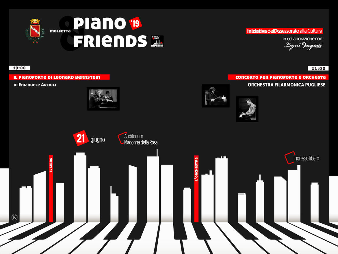 «Molfetta Piano&Freinds – spiega l’Assessore Sara Allegretta – conferma l’evento clou del Concerto per Pianoforte e Orchestra quale massima espressione della fusione dello strumento solista con l’orchestra, teso alla valorizzazione delle eccellenze musicali pugliesi. Si arricchisce, inoltre, quest’anno della presenza del famoso pianista Emanuele Arciuli, che converserà con il pubblico sulla figura del grande direttore e pianista Leonard Bernstein. Il format, ormai noto, avrà sicuramente una notevole ricaduta turistica, unitamente alla valorizzazione di nuovi luoghi en plein air dove ascoltare ottima musica, confermando la nostra città quale punto di riferimento per gli eventi musicali di grande rilievo».