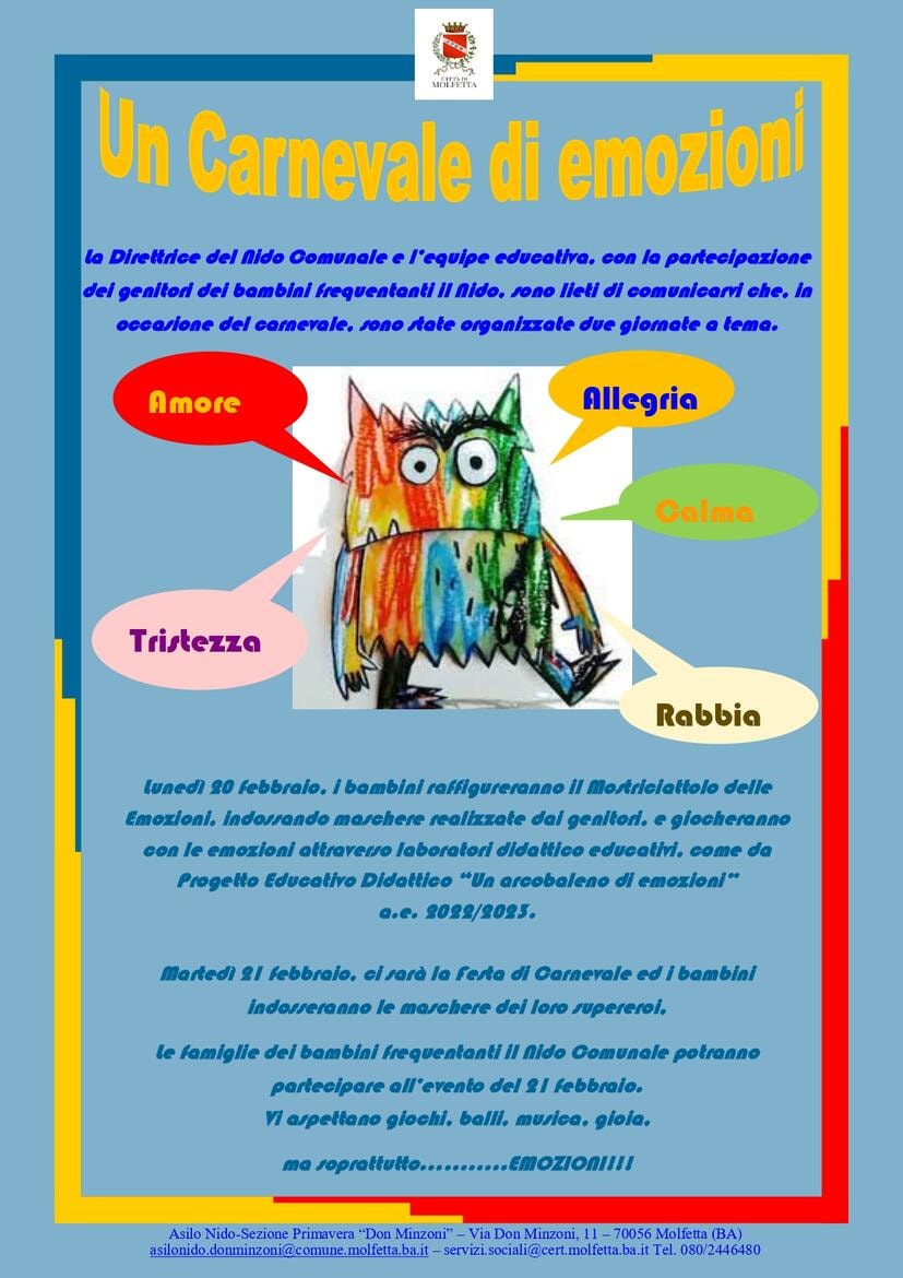 La Direttrice dell’Asilo Nido Comunale, Dr.ssa Augusta Elia, ed il personale educativo, con la partecipazione dei genitori dei bambini frequentanti il Nido, sono lieti di comunicarvi che, in occasione del carnevale, sono state organizzate due giornate a tema. Lunedì 20 febbraio, i bambini raffigureranno il Mostriciattolo delle Emozioni, indossando maschere realizzate dai genitori, e giocheranno con le emozioni attraverso laboratori didatticoeducativi, come da Progetto Educativo Didattico “Un arcobaleno di emozioni” a.e. 2022/2023.