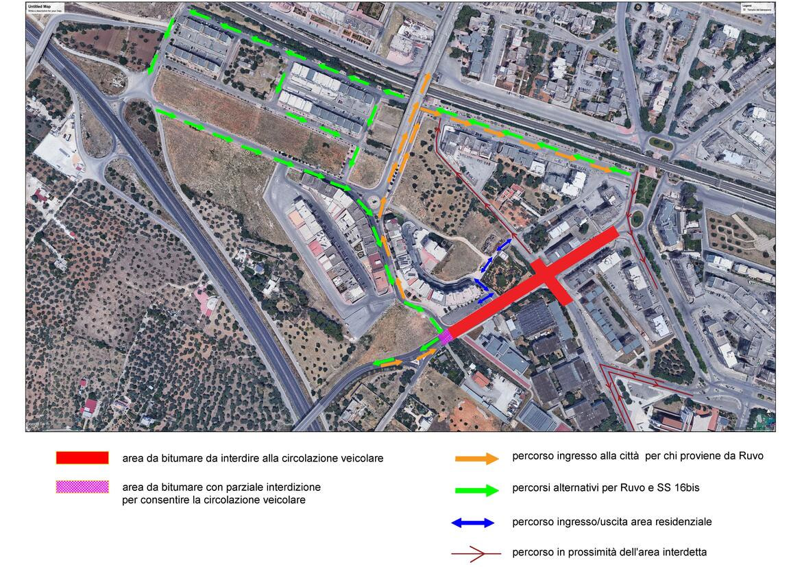 A partire da domani 5 luglio, e fino al 10 luglio, la circolazione stradale a ridosso della rotatoria di Via Ruvo subirà variazioni per consentire la bitumazione delle strade.