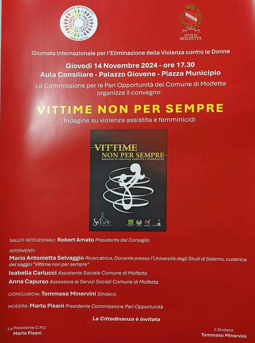 Al convegno, che sarà aperto dal Presidente del Consiglio comunale, Robert Amato, interverranno il Sindaco, Tommaso Minervini, l’assessora ai Servizi Sociali, Anna Capurso, la Presidente della Commissione Pari opportunità, Marta Pisani, l’assistente sociale Isabella Carlucci.